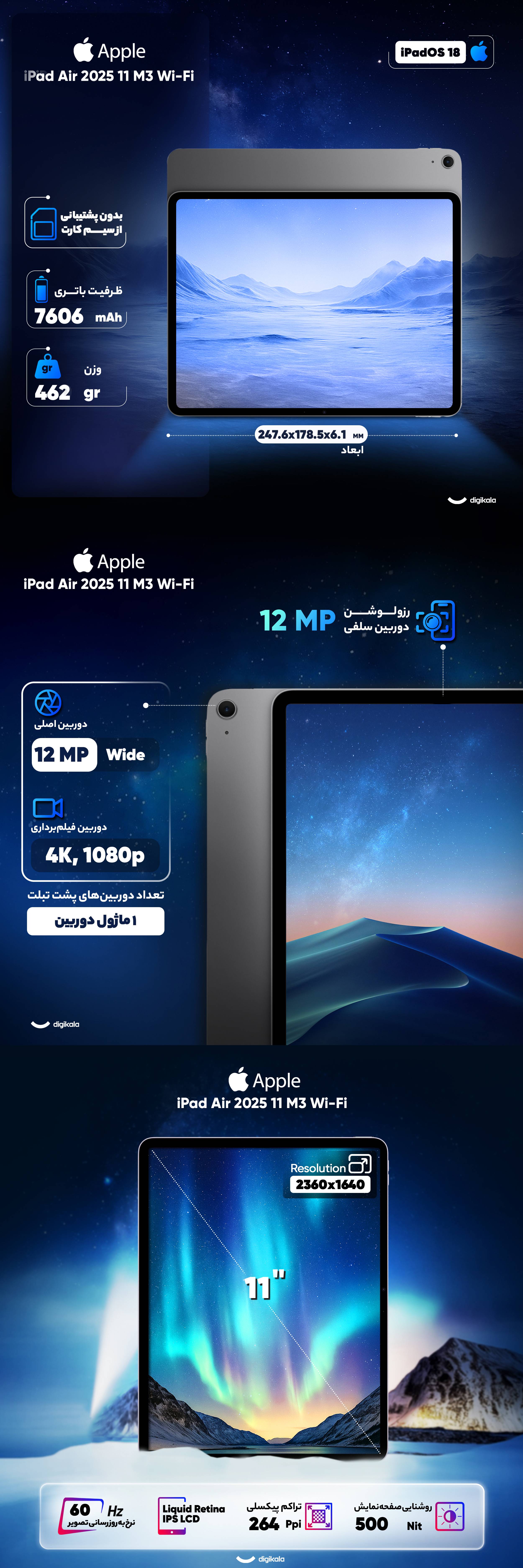 آیپد ایر ۱۱ اینچی ۲۰۲۵ (M3)، با ارتقای قابل توجه در بخش عملکرد به لطف تراشهی قدرتمند M3، همچنان یکی از بهترین و متعادلترین تبلتهای بازار است. این دستگاه با طراحی زیبا و سبک، صفحهنمایش باکیفیت Liquid Retina، عملکرد فوقالعاده سریع، پشتیبانی از لوازم جانبی حرفهای مانند Apple Pencil Pro و Magic Keyboard و عمر باتری مناسب، گزینهای ایدهآل برای طیف وسیعی از کاربران، از دانشجویان و کاربران عادی گرفته تا طراحان، هنرمندان و متخصصانی است که به دنبال یک تبلت قدرتمند، همهکاره و با ارزش خرید بالا در اکوسیستم اپل هستند.