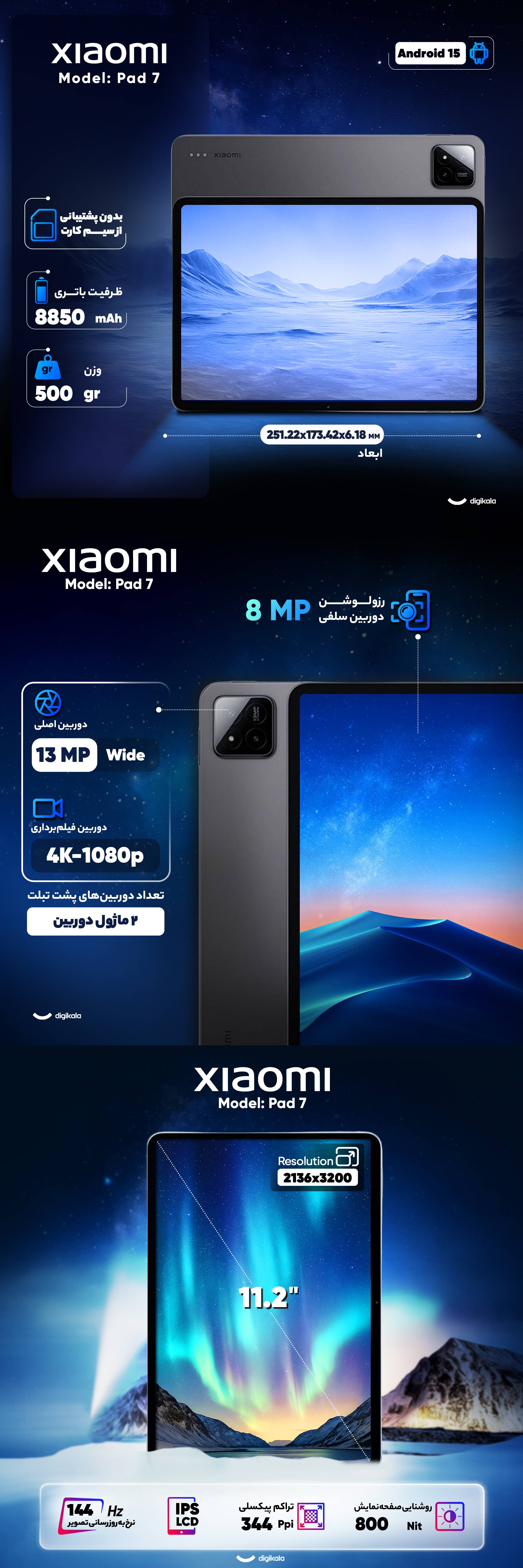 شیائومی Pad 7 یک تبلت میانردهی قدرتمند و همهکاره است که با صفحهنمایش بزرگ و باکیفیت ۱۱.۲ اینچی با نرخ نوسازی ۱۴۴ هرتز، پردازندهی قدرتمند Snapdragon 7+ Gen 3، طراحی زیبا و باریک، باتری حجیم با شارژ سریع و پشتیبانی از لوازم جانبی کاربردی مانند قلم و کیبورد، تجربهای فراتر از انتظار را در ردهی قیمتی خود ارائه میدهد. این تبلت گزینهای هوشمندانه برای کاربرانی است که به دنبال یک دستگاه همهفنحریف برای کار، تحصیل، سرگرمی و خلاقیت هستند و نمیخواهند هزینهی زیادی برای خرید تبلتهای پرچمدار بپردازند.