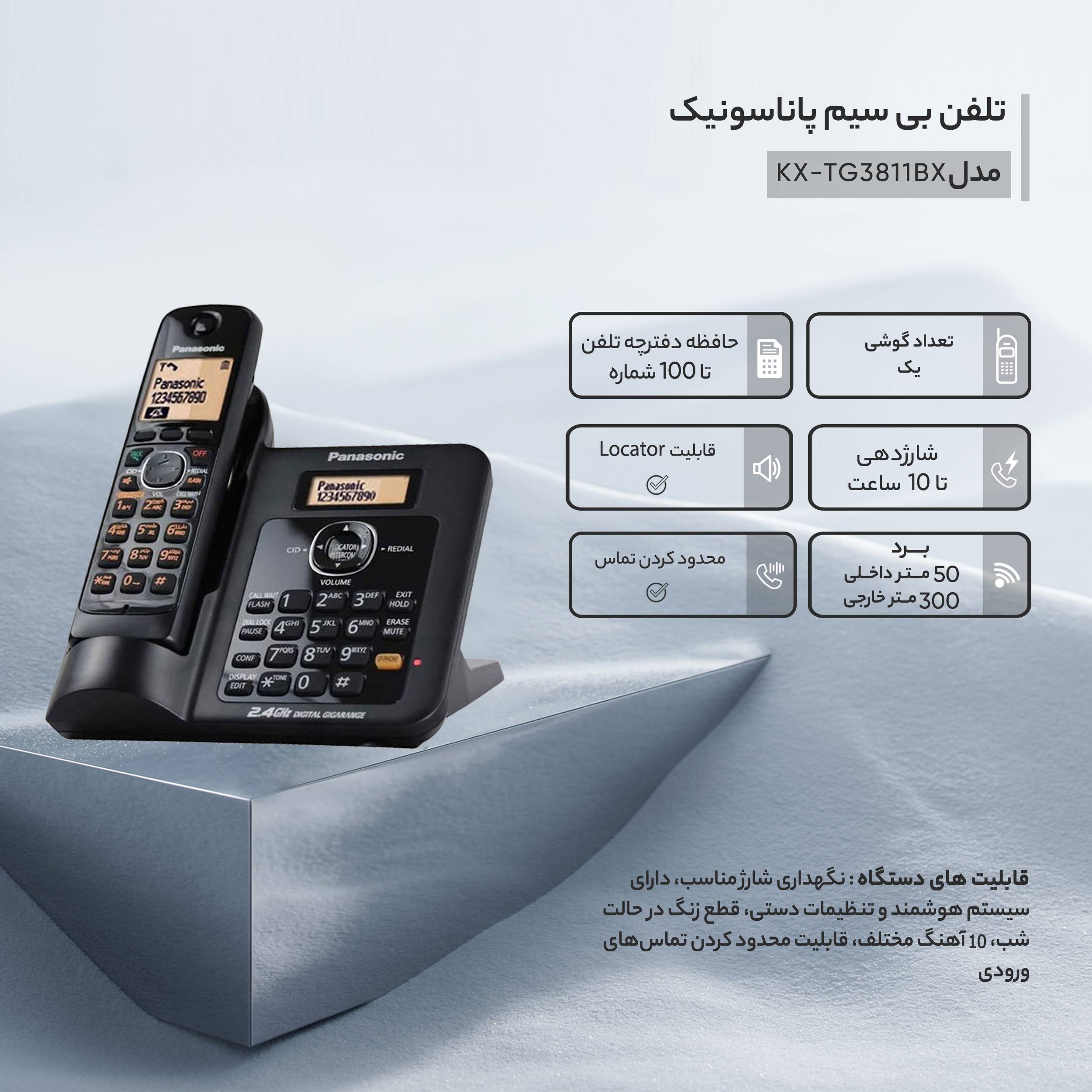 تلفن بیسیم پاناسونیک KX-TG3811BX با یک خط تلفن، دارای فرکانس 2.4 گیگاهرتزی است. کیفیت صدا در این تلفن در درجه بسیار بالایی قرار دارد و از ویژگیهای مهم آن محسوب میشود. برد KX-TG3811BX در فضای بسته 50 متر است، البته این برد در فضای خارجی به 300 متر نیز میرسد. کالر آی دی در این تلفن بیسیم پشتیبانی میشود و حافظه 50 شمارهای دارد. تعداد 100 مخاطب در این تلفن شرکت پاناسونیک قابل ذخیره است.