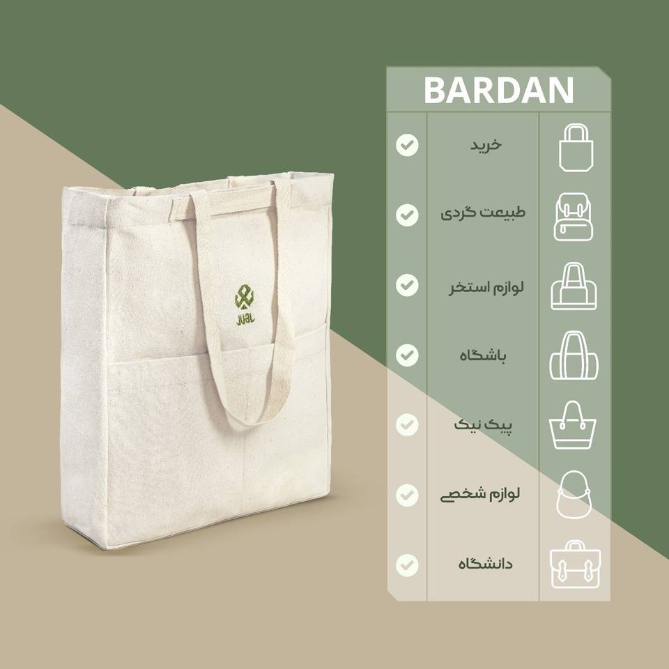 باردان، یک توتبگ (tote bag) زیبا، سبک و جادار بوده که از پارچه متقال تولید شده و از مقاومت و دوام بسیار بالایی برخوردار است. این محصول دارای یک عدد جیب در داخل و دو عدد در جلو است که باعث شده کاربری این محصول را در موارد گوناگون بیشتر کند.